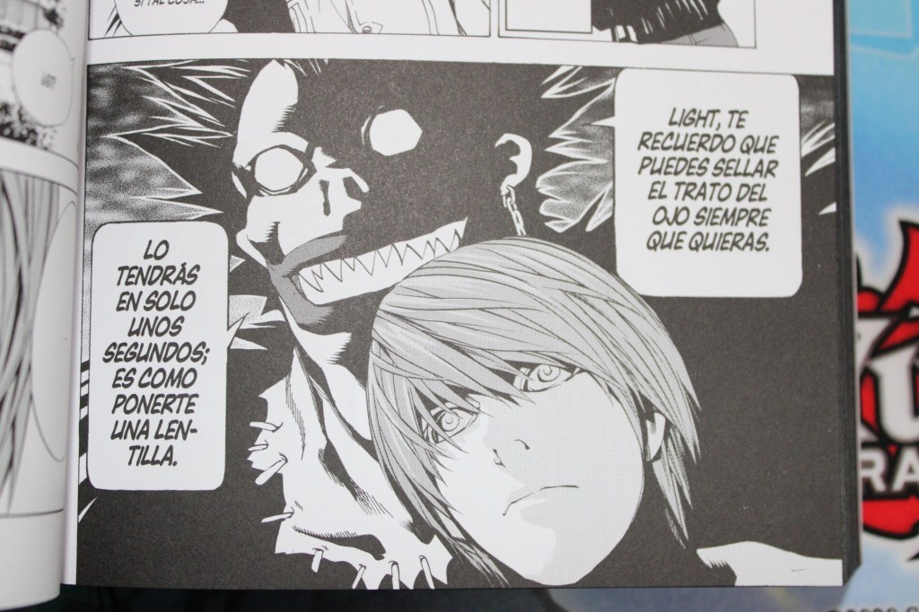 Las primeras paginas de esta edición son a color, mostrándonos a Ryuk en el mundo shinigami, viniendo a la tierra a buscar su Death Note. Y debo decir, que maldito buen diseño de Ryuk, se puede ver tan sombrío de ciertos ángulos y de otros es como un simple raro más. Según mi apreciación todo gracias a los ángulos y sombras, pueden hacer lucir a Ryuk más o menos hostil.